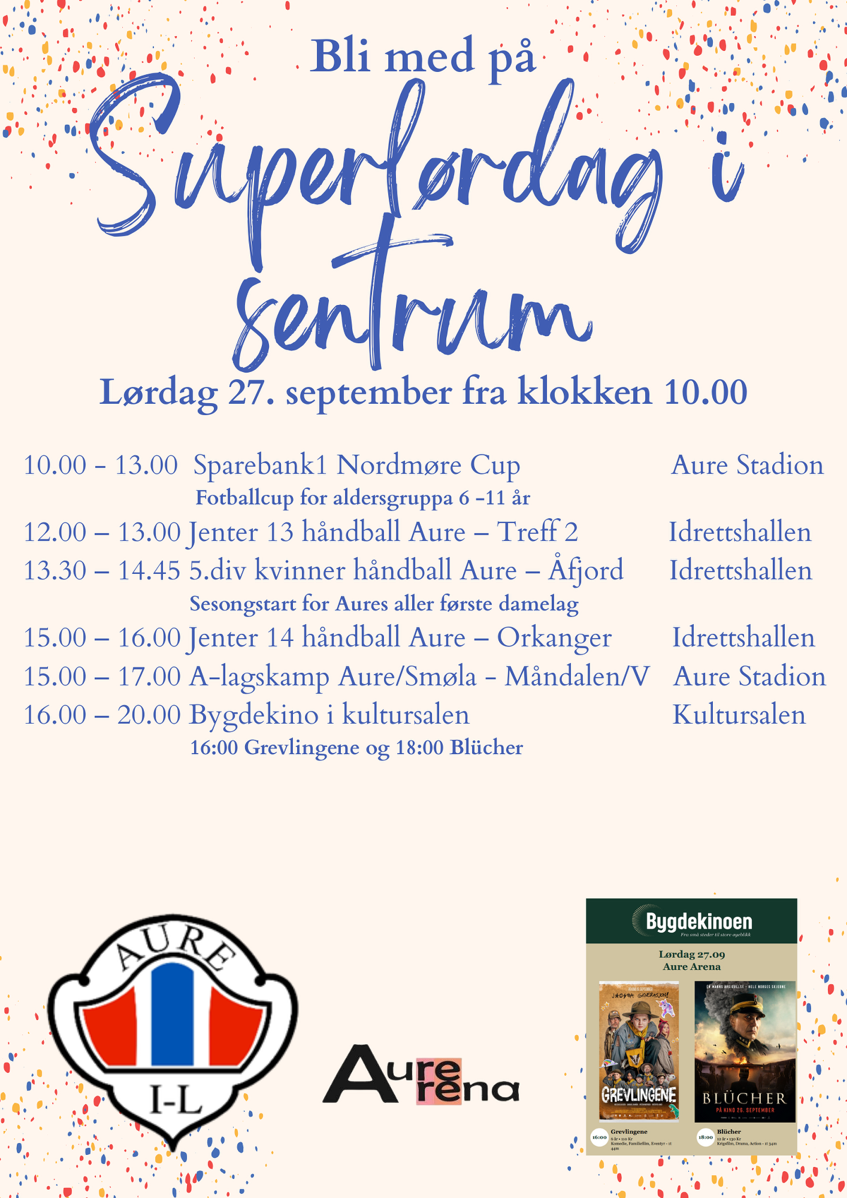 Denne helgen blir det festdag i Aure – med fotball, håndball, opprykksdrama og kino på menyen! ⚽🤾🍿 Det hele skjer i Aure sentrum og Aure Arena – bli med og skap stemning sammen med oss i Aure IL.
